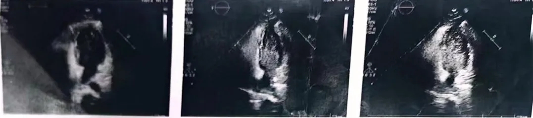 右心声学造影:10ml手振生理盐水,经左上肢贵要静脉快速注入,右房充分显影,静息状态第二个心动周期左心房内见中等量微泡进入,瓦氏动作后即刻左心房内见大量微泡进入。