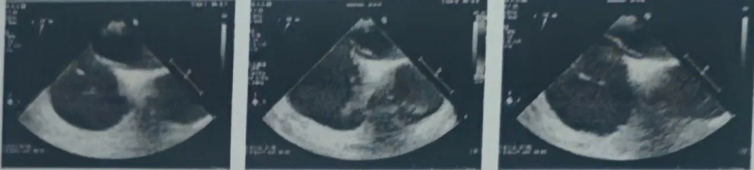 超声下可见封堵器左右盘面牢牢贴靠房间隔,且无残余分流,封堵成功