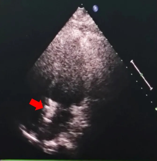 超声诊断:房间隔卵圆孔未闭,体部及耳部未见明显血栓