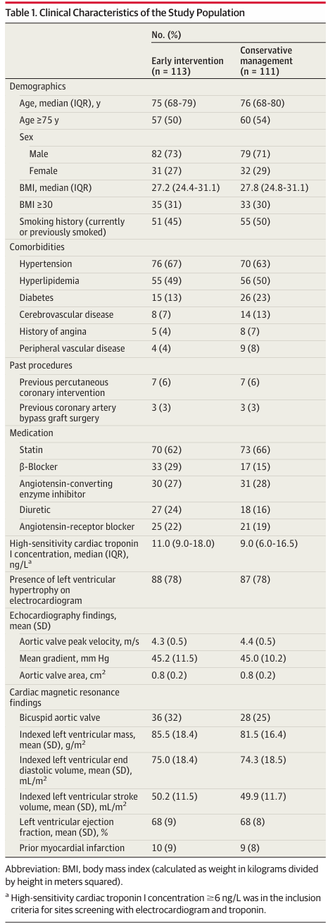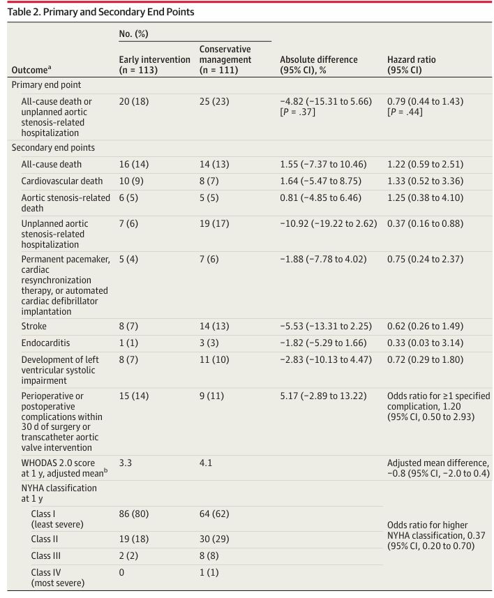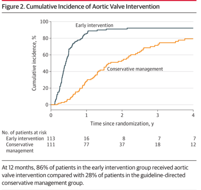 在12个月内,早期干预组中86%的患者接受了主动脉瓣介入治疗,而指南指导的保守治疗组中这一比例为28%。