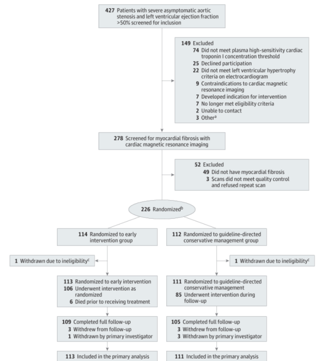EVOLVED是一项在英国和澳大利亚24个心脏中心开展的前瞻性、随机、开放标签、盲终点试验。纳入标准为无症状重度AS(主动脉瓣峰值流速≥4.0 m/s或瓣口面积指数<0.6 cm²/m²)且存在心肌纤维化(通过心脏磁共振延迟强化显像确认)的患者。患者按1:1随机分配至早期干预组(TAVR或SAVR)或指南指导的保守管理组。主要终点为全因死亡或非计划AS相关住院的复合终点,次要终点包括主要终点事件、12个月NYHA分级、左室功能变化、残疾评分(WHODAS 2.0)等。