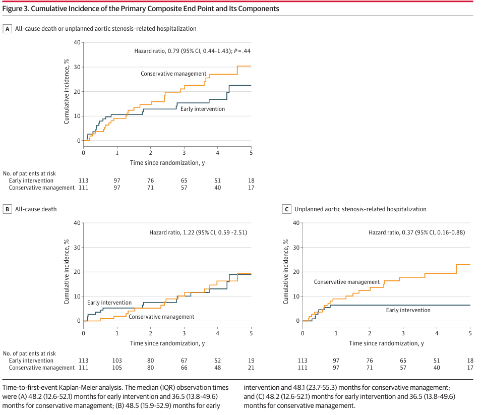 2017年8月至2022年10月,共224例患者被随机分组(早期干预组113例,保守管理组111例)。中位随访42个月。主要复合终点在早期干预组发生18%,保守管理组为23%(HR 0.79, 95% CI: 0.44–1.43; P=0.44),差异无统计学意义。全因死亡率两组相似(14% vs 13%),但早期干预组非计划AS相关住院率显著更低(6% vs 17%; HR 0.37, 95% CI: 0.16–0.88)。此外,早期干预组在12个月时NYHA II–IV级症状发生率更低(19.7% vs 37.9%; OR 0.37, 95% CI: 0.20–0.70)。