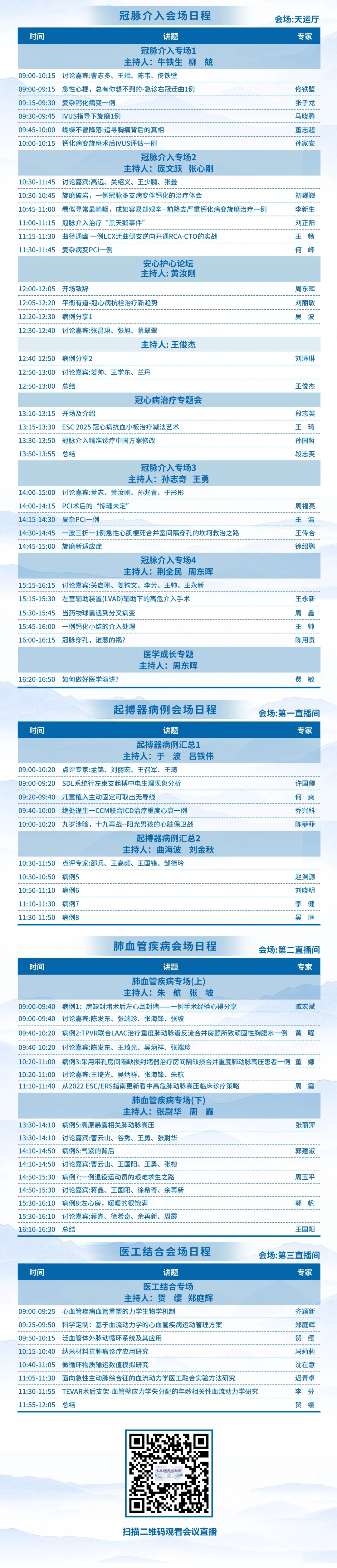冠脉介入专场以“实战破局,技术精进”为核心,精心筹备了4大专场接力开讲,每一场都堪称冠脉诊疗领域的“实战教科书”——针对急性心梗、不明原因胸痛等领域的病例分享,让您在“惊魂未定”中直面临床急救的生死时速,感受从病情突变到精准干预的紧张博弈;对旋磨术、LVAD辅助下高危冠脉介入手术等硬核操作的细节拆解,搭配清晰的术程影像同步解读,将使复杂技术不再抽象,使前沿技术更好的落地实践;针对“冠脉穿孔”“分叉病变”“右冠迂曲”“严重钙化”等临床棘手问题,多位国内冠脉介入领域的权威专家将亲临会场,带领现场及线上医者展开沉浸式讨论。整个专场从病例解析到技术实操,从问题探讨到经验传承,全方位覆盖冠脉介入诊疗的难点、重点与创新点,为不同层级的医者搭建起高效的学术交流桥梁。