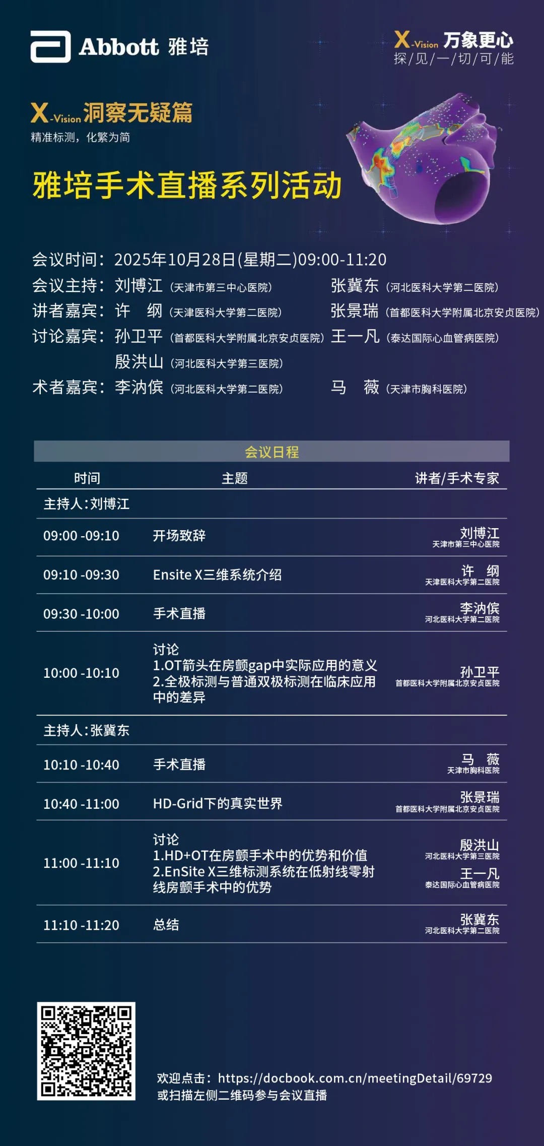 X-Vision洞察无疑篇手术直播将于2025年10月28日09:00再度启航!通过手术直播、专题讲座和技术讨论,全方位展示雅培房颤整体解决方案的临床价值及操作亮点,为与会者带来深度技术解析与实践指导。