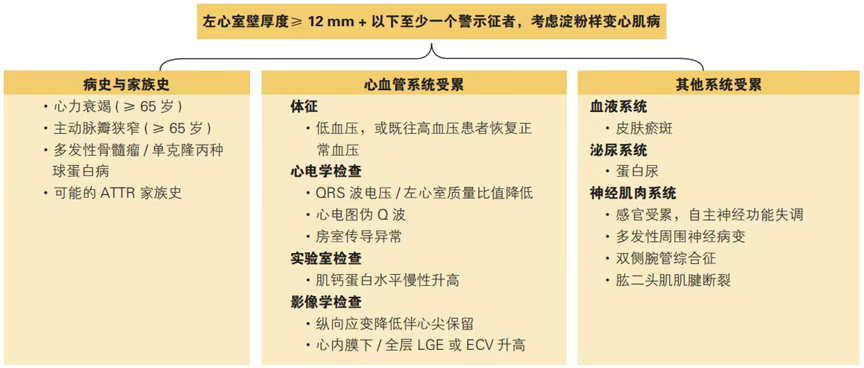左心室肥厚伴相关警示征时,需考虑淀粉样变心肌病的可能。进一步结合血清/尿免疫固定电泳及血清游离轻链检测、心电图、超声心动图、CMR、放射性核素、冠状动脉CTA、心内膜心肌活检和基因检测等方法可确诊。