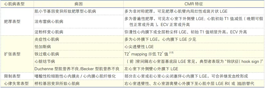 不同心肌病表型可能病因的CMR特征