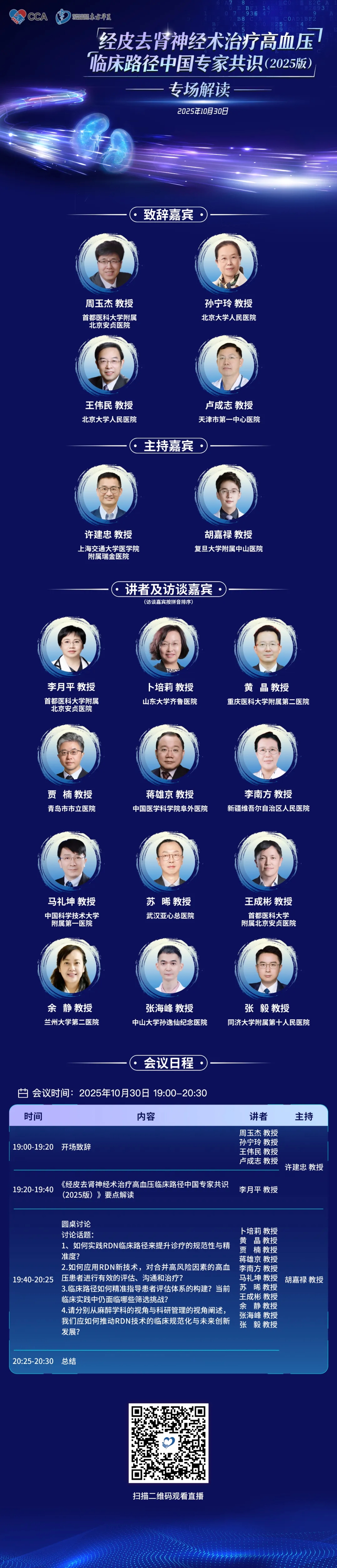 直播预告 |《经皮去肾神经术治疗高血压临床路径中国专家共识(2025版)》专场解读会带你解码RDN 技术核心 2025-10-29 18:40:00 浏览量:12 由中国心血管健康联盟和苏州工业园区东方华夏心血管健康研究院主办的《经皮去肾神经术治疗高血压临床路径中国专家共识(2025版)》专场解读会即将于10月30日晚19:00在医谱APP中进行直播。 诸位大咖齐聚线上,为 RDN 临床路径全流程 “划重点”:从 “哪些患者适合做” 到 “术中如何规范操作”,再到 “术后怎么随访”,全程科学指引,避免技术 “走样”,帮你快速掌握 “从理论到实践” 的转化方法,让 RDN 技术真正落地临床、惠及患者。 ↓↓↓↓↓↓ END 专业的心血管医生学术交流平台 医谱APP 点击下载 医谱学术 点击关注 版权及免责声明: 本网站所发表内容知识产权归属医谱平台、主办方以及原作者等相关权利人,未经许可,禁止进行复制、传播、展示、镜像、转载、摘编等。经授权使用,须注明来源,否则将追究其法律责任。有关作品内容、版权和其他问题请与本网联系