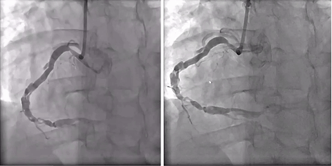 患者29岁男性,3月前运动后突发胸痛,ECG下壁导联ST段抬高,外院急诊冠脉造影提示右冠中段闭塞,行RCA PTCA+血栓抽吸+冠脉内溶栓;2月前复查冠状动脉造影血管再通,存在明显附壁血栓+血管瘤样扩张改变,当地医院未进一步治疗,予阿司匹林100mg+氯吡格雷75mg+利伐沙班10mg抗凝治疗。术后,患者仍间断胸闷不适,遂前往阜外医院进一步诊治。