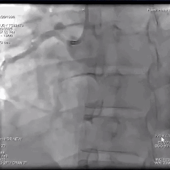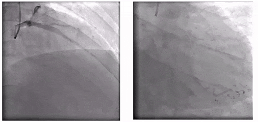 冠状动脉造影显示,左冠脉整体状况尚可;右冠脉呈弥漫性严重病变,病变核心位于第二转折区,表现为典型血管编织样改变及多腔结构(至少两个假腔)。具体受累范围包括:(1)中远段弥漫性扩张伴血管分层;(2)第二转折后严重狭窄及继发的狭窄后扩张(累及PLA);(3)PDA全程弥漫性重度狭窄。结合患者症状持续+狭窄严重+真腔存在连通可能,决定再次行介入治疗。