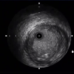 随后,IVUS评估显示,右冠脉管径过大,且机化血栓负荷重,如直接植入支架/放置药球可能导致支架贴壁不良/药球膨胀不全及血流恢复不佳等,决定在支架植入/药球放置前先行血栓消蚀。