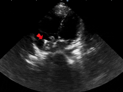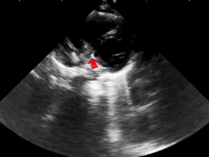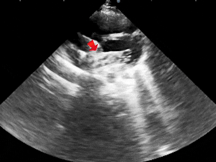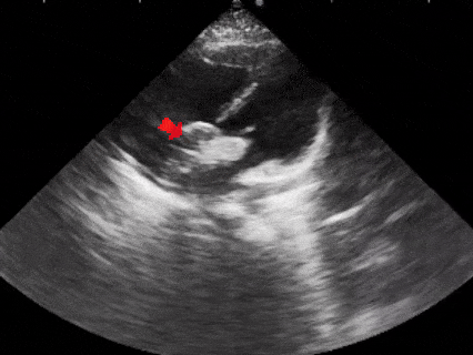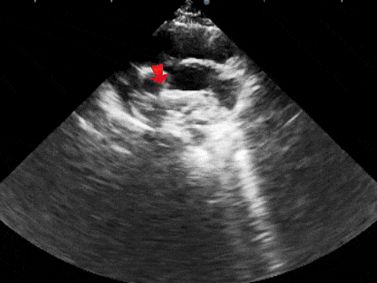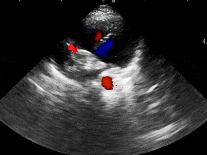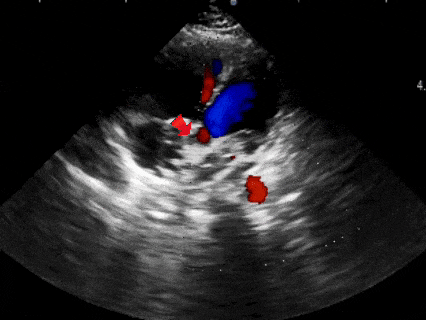 超声下观察封堵器,左右盘面在房间隔两侧,彩超下无残余分流