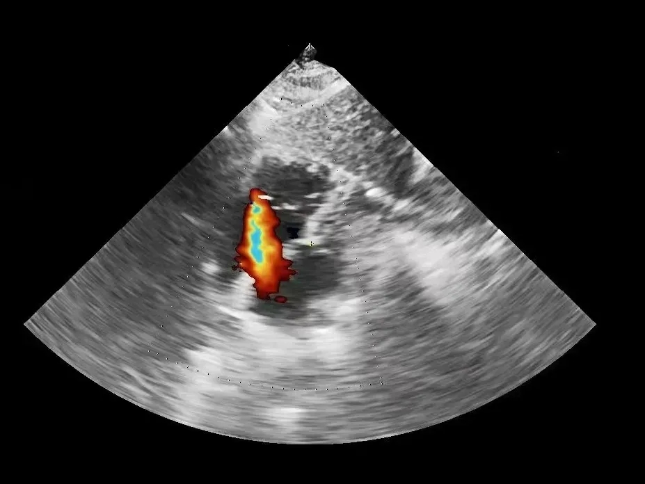 先天性心脏病:房间隔缺损(中央型)。房水平左向右分流,右心增大,三尖瓣反流(轻度),肺动脉高压(中度),左室收缩功能正常。