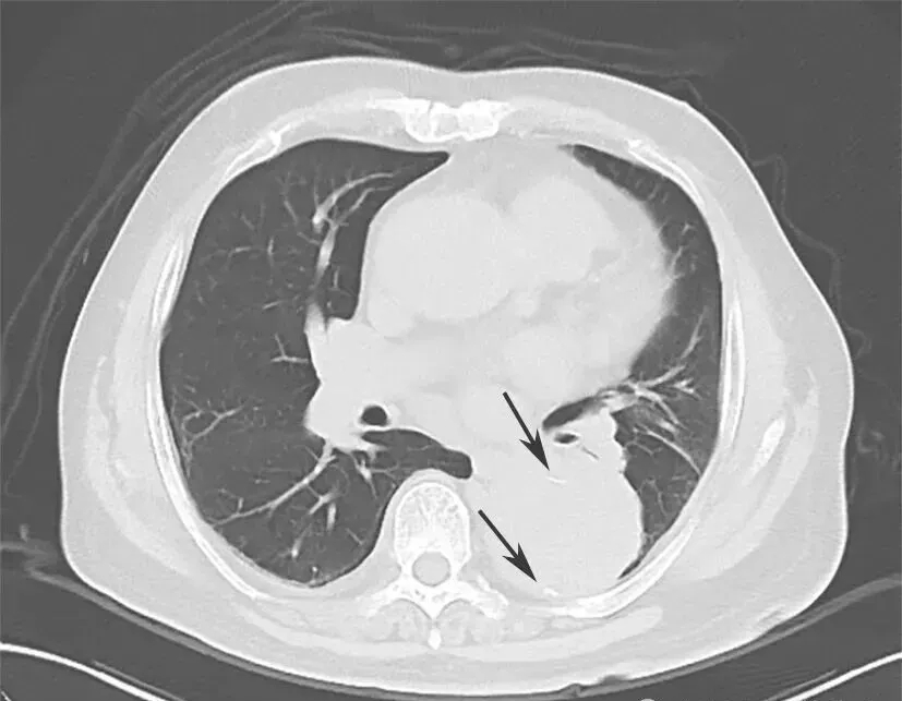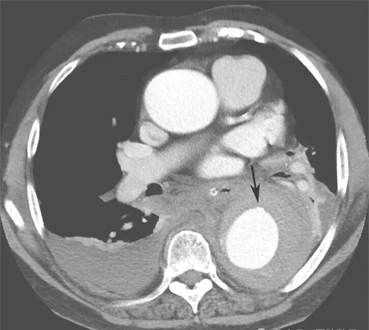 入院后紧急行血管螺旋CT扫描+三维重建,以明确主动脉病变。血管螺旋CT扫描+三维重建如图2所示。降主动脉至腹主动脉夹层动脉瘤并壁间血肿形成(累及主动脉弓至肾动脉开口平面)。升主动脉管径约4.9cm。主动脉弓与降主动脉弥漫管腔增粗,周围可见弥漫壁间血肿形成,向下延伸至肾动脉平面。主动脉弓上三大分支开口与显影良好。主动脉弓外径为5.4cm,内径约3.8cm。降主动脉外径为7.5cm,内径为4.8cm。气管隆嵴下平面降主动脉左前壁局限性钙化上方有一个溃疡,溃疡内有少量对比剂充盈。胸主动脉下段向右侧明显迂曲。腹主动脉与肾动脉平面上方可见内膜片与真假腔形成,假腔内有少量造影剂充填。腹腔干动脉和肠系膜上动脉开口未见受累。右肾动脉开口部分受累,左肾动脉开口未见受累。腹主动脉下段、双侧髂内外动脉血管形态良好。双侧胸腔中等量积(血)液(图3箭头处)。