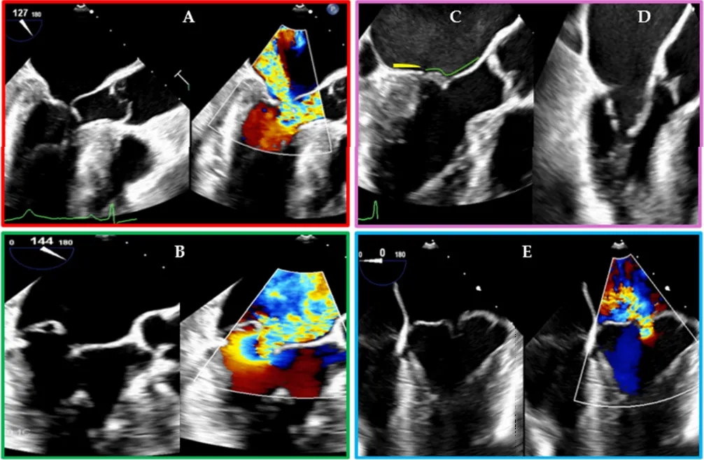 图2.导致二尖瓣反流的不同二尖瓣病变的经食管超声心动图表现:(A)因室间隔基底段肥厚和左心室腔狭小导致二尖瓣叶收缩期前向运动引起的二尖瓣反流;(B)二尖瓣后叶(PML)脱垂引起的二尖瓣反流;(C)心房功能性二尖瓣反流病例:注意二尖瓣后叶的附着点(黄线)向后移位至左心室嵴上方,使其看起来较短,且接合区也向后移位;绿线描绘二尖瓣前叶;(D)风湿性二尖瓣疾病引起的二尖瓣反流病例:注意二尖瓣叶舒张期呈圆顶状;(E)二尖瓣前叶和后叶双叶脱垂引起的二尖瓣反流;(A、B、E)图同时显示二维模式和二维彩色多普勒图像。