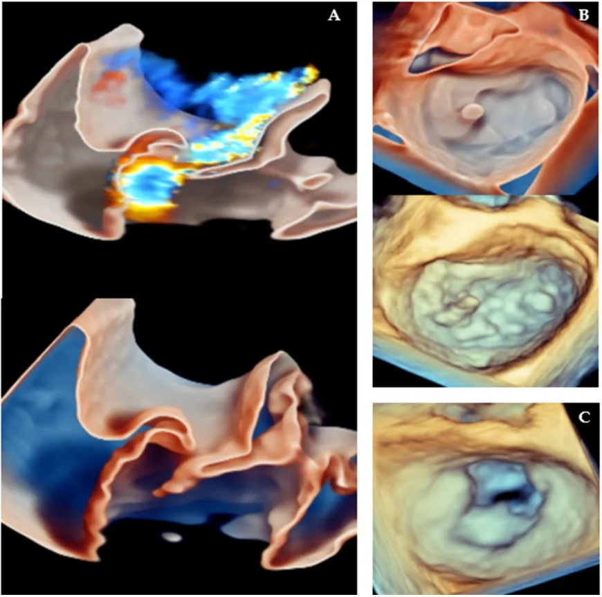 图6.导致二尖瓣反流的二尖瓣病变的三维经食管超声心动图表现:(A)使用玻璃渲染模式显示的二尖瓣后叶连枷,分别为带三维彩色(上方)和不带三维彩色(下方);(B)二尖瓣的“正面” 视图,显示二尖瓣后叶P1扇叶小部分的连枷,分别为带玻璃渲染模式(上方)和不带玻璃渲染模式(下方);(C)二尖瓣反流患者风湿性二尖瓣的“正面”视图(本例中二尖瓣修复术不可行)。