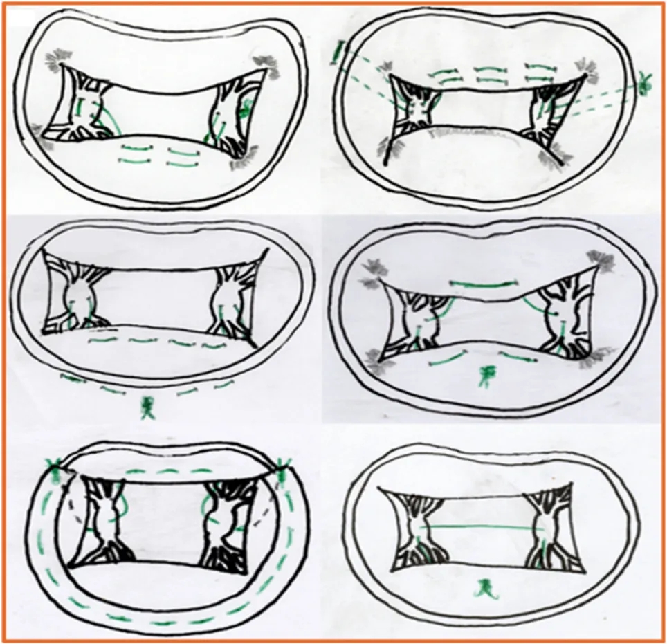 图3.不同外科腱索植入技术的示意图:从左上角开始顺时针方向,展示了以下外科技术:罗马拱技术、米诺陶技术、“V”形技术、方形技术、ARGO技术和束带技术;缝线以绿色表示;在某些情况下,绘制了虚线以更好地描绘缝线的路径。