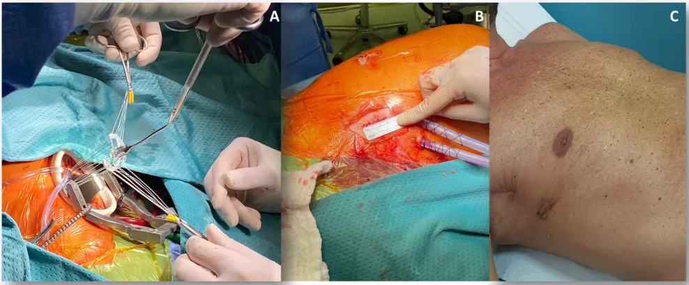 图1.经右侧小切口开胸的微创二尖瓣修复术:(A)显示通过右侧小切口开胸入路放置二尖瓣瓣环成形环的过程;(B)描绘修复后的最终结果,移除牵开器和手术器械后,放置引流管并缝合切口;(C)展示最终手术疤痕,与胸骨正中切开术相比,美容效果更优,对患者的影响更小。