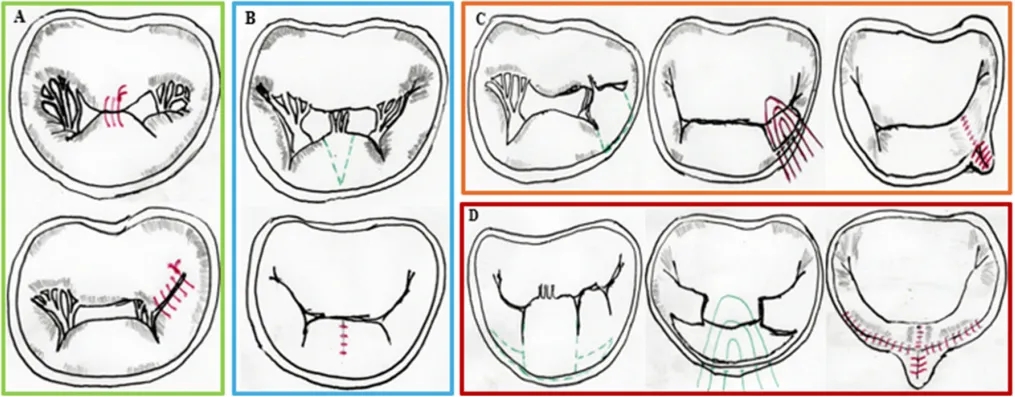 图4.外科二尖瓣修复术主要技术的示意图:(A)缘对缘缝合术(也称为阿尔菲里缝合术),分别位于A2-P2(上方)和A3-P3(下方)位置;(B)三角形切除术:绿色虚线表示瓣叶切除部位(上方);平行的红色实线代表切除后随后的瓣叶缝合(下方);(C)带瓣环折叠的四边形切除术:绿色虚线代表将要进行切除的部位(P2M2P3);红色实线是将要放置的瓣环折叠缝线;平行的红色实线代表修复结束时的缝线;(D)带滑动成形术的四边形切除术:切除部位由绿色虚线划定;绿色实线代表缝线;红色实线表示最终结果。