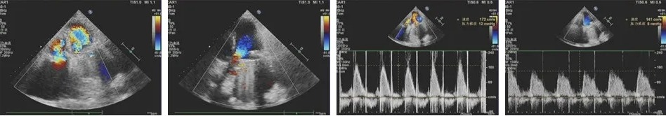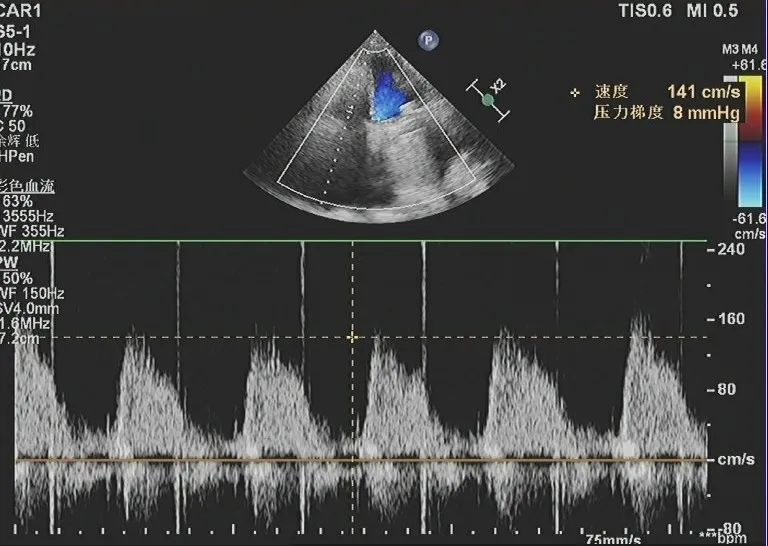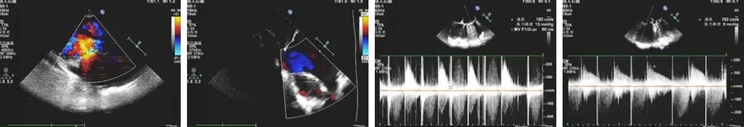 2、 三尖瓣位生物瓣口中大量返流;三尖瓣位生物瓣架固定,瓣叶无异常回声附着,瓣叶开放尚可,关闭不拢,瓣周未见明显异常回声。
