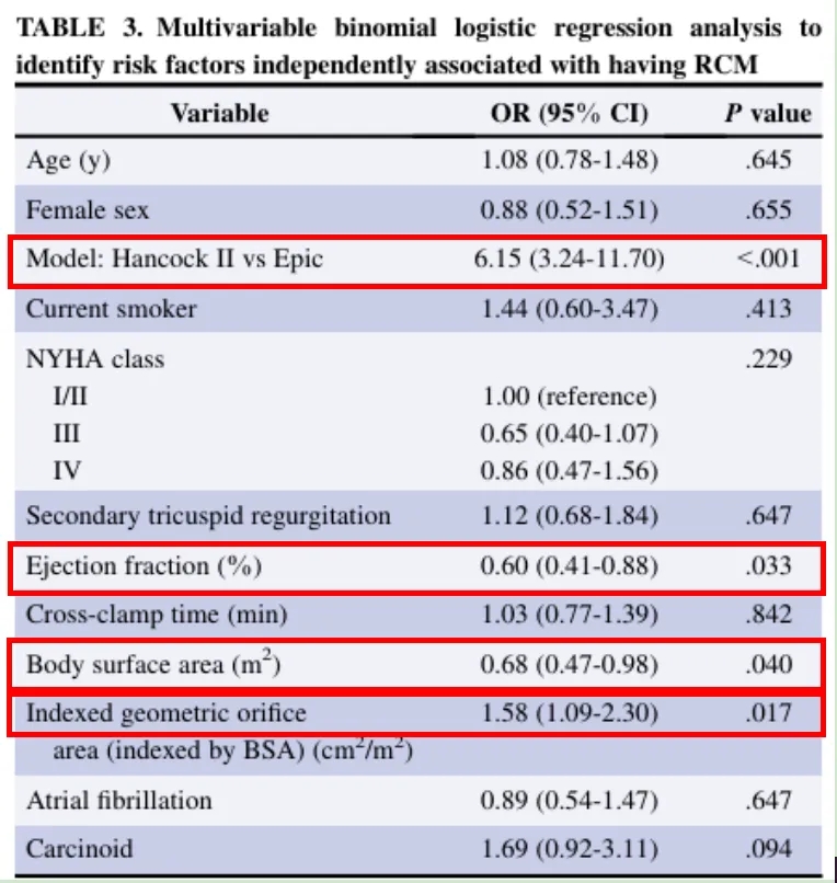 2. 危险因素:经多因素回归分析发现,以下因素与RCM显著相关:瓣膜型号:Hancock II vs. Epic(OR=6.15,P<0.001);较大的瓣膜开口面积(GOA,OR=1.58,P=0.017);较小的体表面积(BSA)(OR=0.68,P=0.040); 较低的左心射血分数(LVEF)(OR=0.60,P=0.033)。