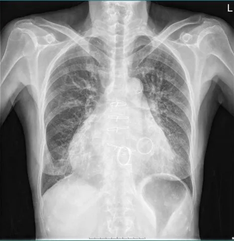 心脏瓣膜病术后:双肺纹理增多、增粗,双下肺野见少许斑片状模糊影;双肺门不大,主动脉结不宽,肺动脉段平直,心影增大,心胸比率:0.68。双侧膈面光整,双侧肋膈角锐利。心影内见术后环形金属密度影。 胸骨见术后内固定钢丝影,未见断裂、松动征象。