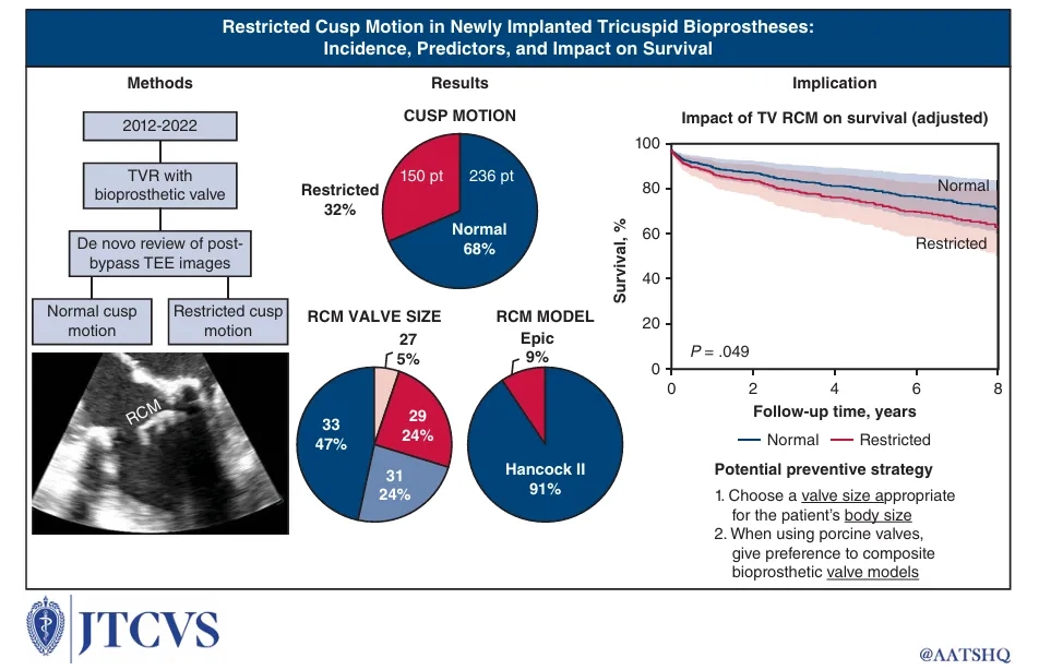 来自梅奥(Mayo Clinic, Rochester)的Juan A. Crestanello教授团队在最近队生物瓣膜瓣叶活动受限(RCM)做了回顾性队列的研究(2012-2022): 评估RCM在新植入三尖瓣生物瓣膜中发生的频率;明确其相关危险因素;探讨对患者远期生存率的影响。