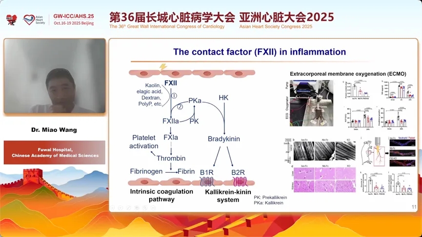 中国医学科学院阜外医院的王淼教授系统介绍了他实验室在缺血性心脏病炎症与干预领域的多个创新性工作。他首先揭示了前列腺素在心肌保护中的精细调控作用,发现补充花生四烯酸并联用阿司匹林,可协同增强保护性前列腺素(PGI2/PGE2)的合成,改善心功能。其次,他鉴定出磷酸二酯酶4B(PDE4B)是缺血心肌中一个关键的促炎分子,抑制PDE4B能有效减轻炎症、改善微循环。更具颠覆性的是,他揭示了传统凝血因子FXII在“血栓炎症”中的核心作用,证明抑制FXII不仅能抗栓,还能显著抑制中性粒细胞的活化与黏附,为治疗ECMO等场景下的全身性炎症提供了新靶点。最后,他展示了其团队构建的一种新型冠状动脉粥样硬化小鼠模型,该模型能快速、特异性地在冠脉而非主动脉形成易损斑块和心肌梗死,完美模拟了人类冠心病病程,为相关研究提供了强大的工具。