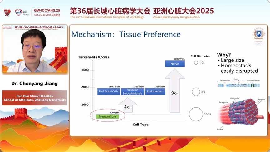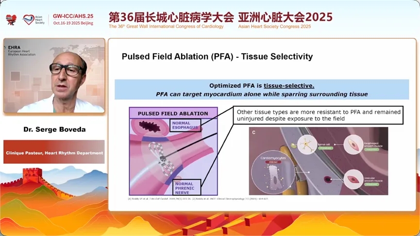 法国图卢兹Clinique Pasteur的Serge Boveda教授首先揭示了PFA的神秘面纱。他讲解道,PFA通过在心肌细胞膜上制造微孔(不可逆电穿孔),导致细胞凋亡,从而实现消融。其革命性优势在于“组织选择性”——这并非真正的识别,而是基于不同组织对电穿孔的损伤阈值不同。心肌细胞的阈值远低于神经、血管平滑肌及食管组织,因此PFA能以“巧劲”精准毁损心肌,而几乎不损伤周边重要组织,从根本上解决了传统热能量消融(射频、冷冻)的附带损伤风险。