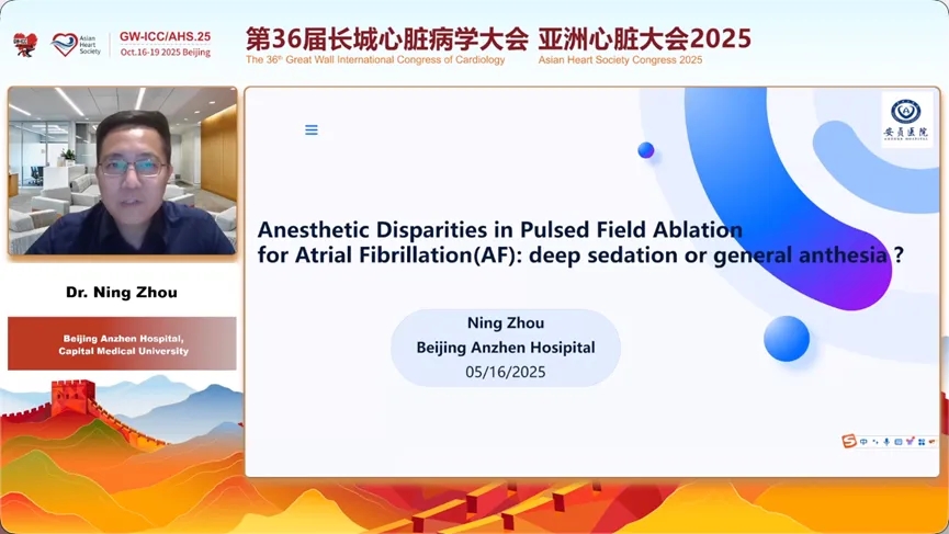 来自首都医科大学附属北京安贞医院的周宁教授,针对PFA手术流程中的关键一环——麻醉方式的选择,提出了深刻见解。他指出,随着PFA技术将房颤消融手术时间大幅缩短,传统的全身麻醉(GA)模式可能成为限制手术室效率的“瓶颈”。因此,探索更高效、同样安全的麻醉方案至关重要。