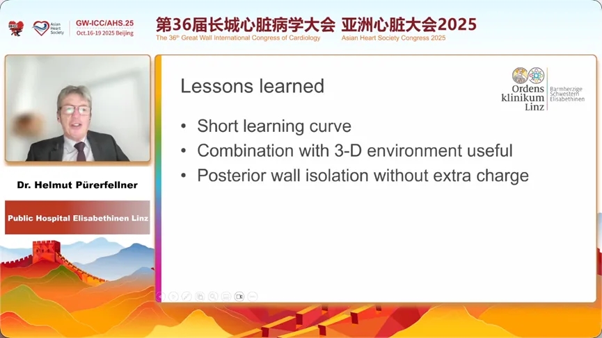 在第36届长城心脏病学大会暨亚洲心脏大会2025期间,欧洲心律协会(EHRA)与长城会联合举办的“脉冲电场房颤消融术(PFA)”专题论坛在线上火热进行。本次论坛由EHRA现任主席、奥地利林茨伊丽莎白医院的Helmut Pürerfellner教授与浙江大学医学院附属邵逸夫医院的蒋晨阳教授共同主持,四位全球顶尖电生理专家围绕PFA的工作原理、麻醉选择、器械进展及未来地位等核心议题,进行了一场全方位、深层次的权威解析。