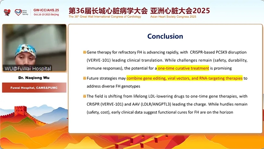 当前基因治疗的主要靶点是PCSK9和ANGPTL3基因,通过在肝脏中将其永久性“敲除”,以期实现LDL-C水平的终生降低。她重点介绍了全球首个进入临床试验的体内碱基编辑疗法Verve-101,该疗法通过单次给药,靶向沉默PCSK9基因。这些前沿探索预示着,对于FH这类单基因遗传病,人类正从“终生服药”的时代,迈向“一次治疗,终生治愈”的全新纪元。