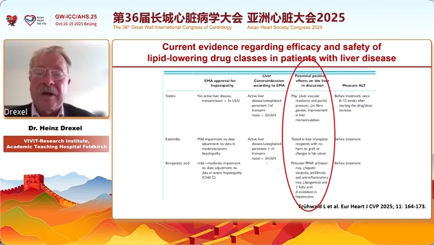 奥地利VIVIT研究所的Heinz Drexel教授聚焦于日益普遍的临床挑战——合并多种疾病患者的血脂管理。他有力地驳斥了临床实践中一些根深蒂固的“禁区”和误解。针对慢性肾脏病(CKD)患者,他展示数据表明,不必担心“J曲线”效应,即使在肾功能严重受损(非透析)的患者中,更低的LDL-C水平依然与更低的心血管风险相关,他汀类药物安全有效。对于肝病患者,他指出,临床上对“他汀伤肝”的担忧被过度夸大了,轻度转氨酶升高通常没有临床意义,反而有研究显示他汀对非酒精性脂肪肝等疾病可能存在益处。对于1型糖尿病患者,尽管高质量的RCT证据相对较少,但指南和真实世界数据均强烈支持在此类高危人群中使用他汀进行心血管预防。