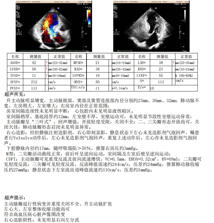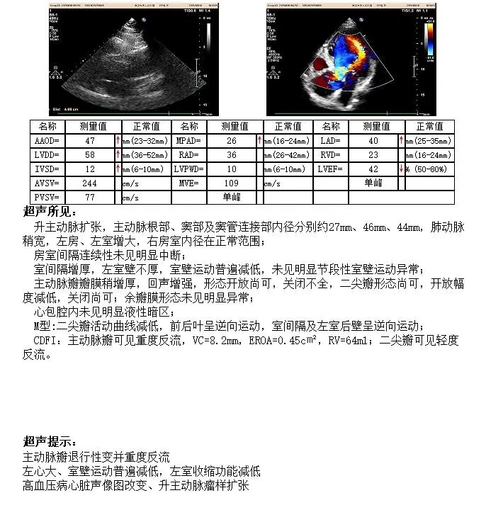 主动脉瓣可见重度反流 VC=8.2mm,EROA=0.45cm,RV=64m1