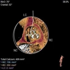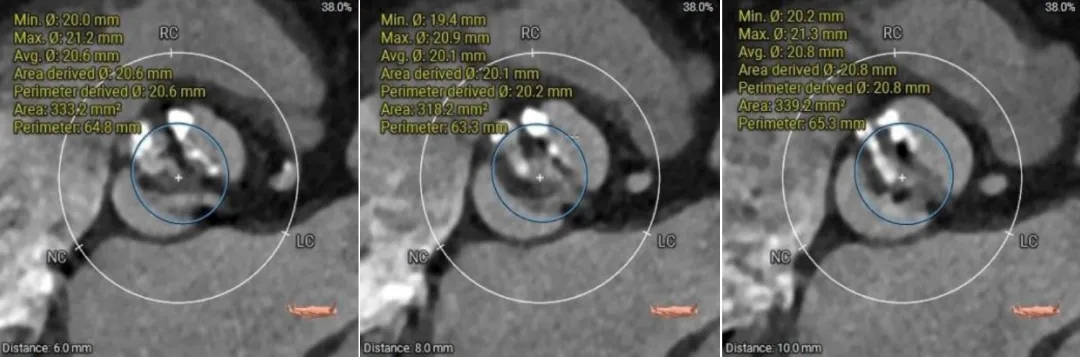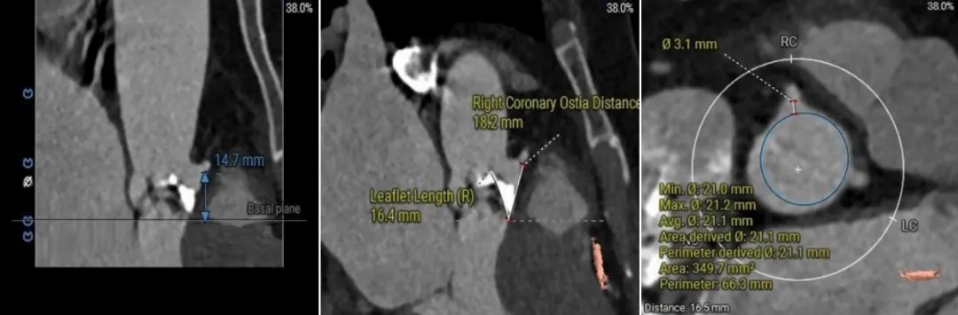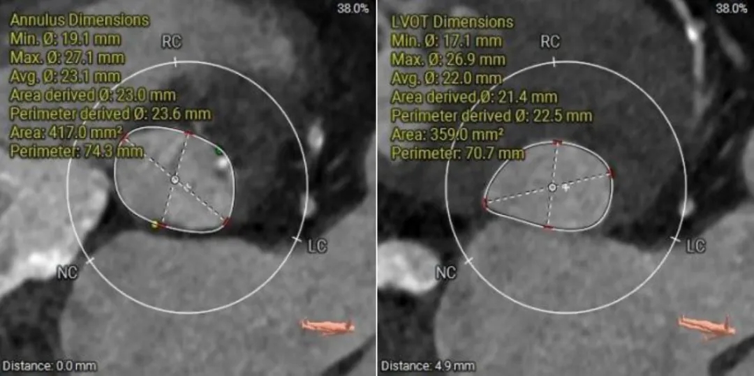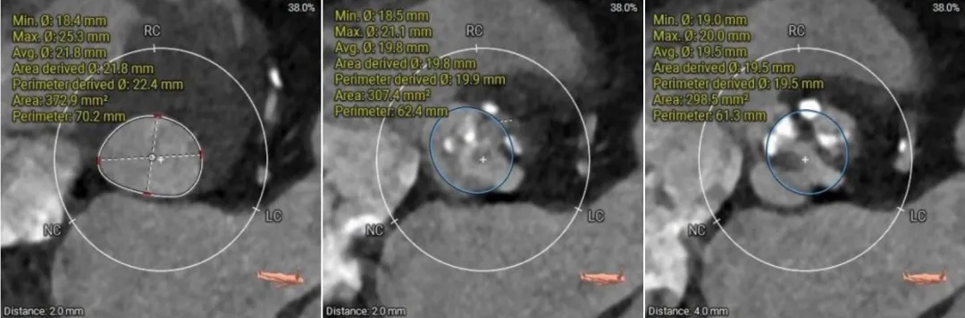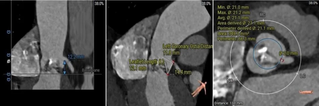 (2)窦部空间较小,左侧瓣叶冗长,且开口位置在短轴平面,左冠冠脉风险较高,优先选择有收腰设计的瓣膜,降低冠脉风险并保留术后足够的VTC