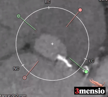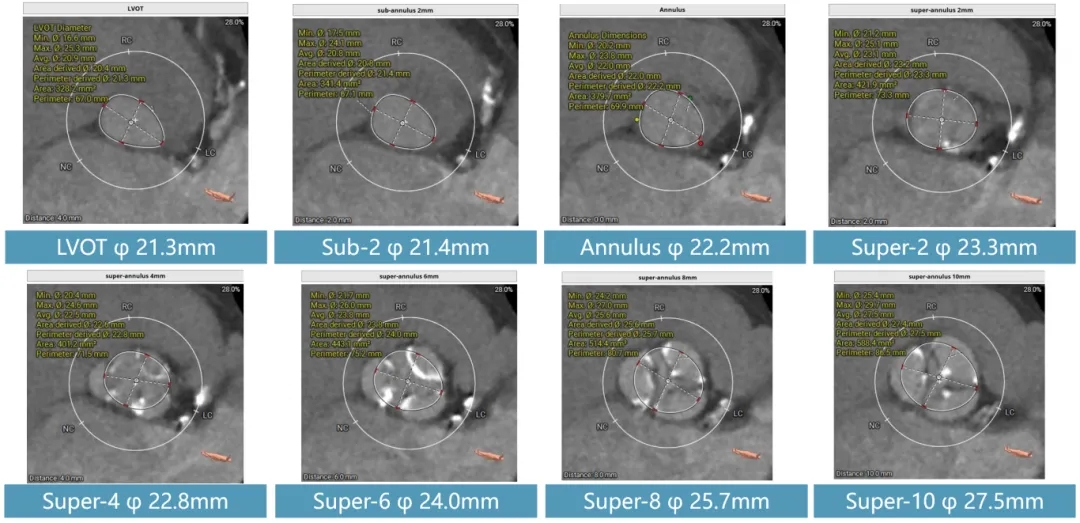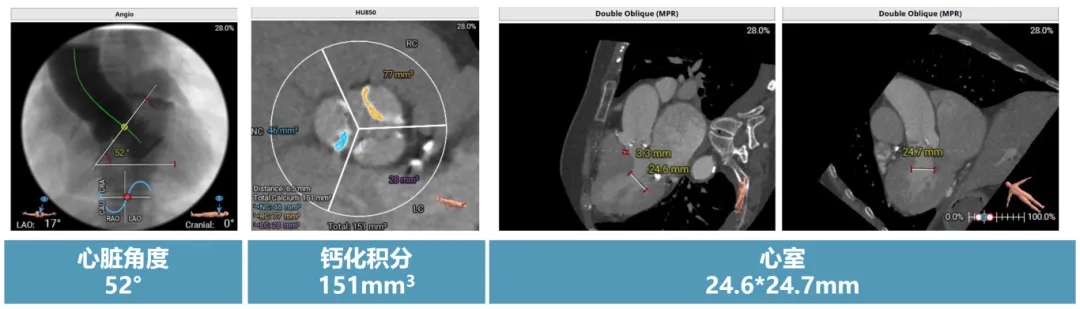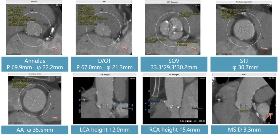 三叶式主动脉瓣,瓣叶钙化。瓣环径 22.2mm,LVOT 21.3mm,瓣上无明显限制,窦部空间可,冠脉高度可。