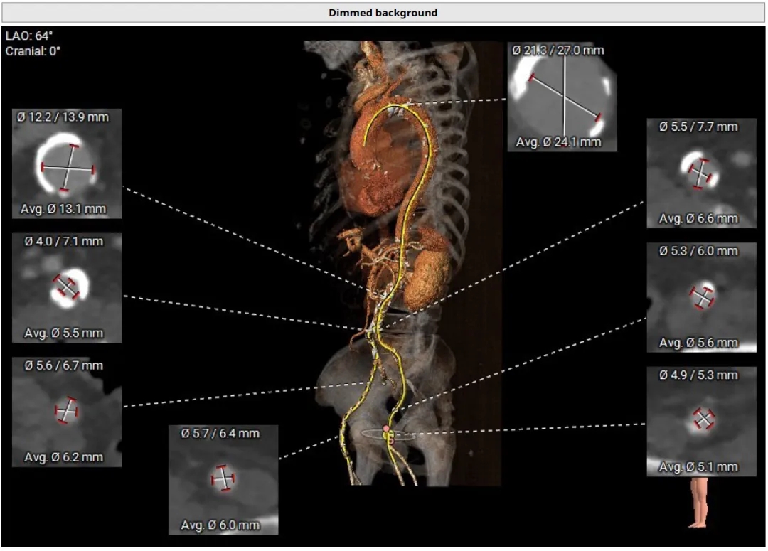 手术入路方面,主动脉弓大弯侧弥漫性钙化,降主动脉粥样硬化伴钙化,右侧髂总动脉近环形钙化,内径稍小。左侧髂总动脉内径可,双侧髂外及股动脉内径可,右股动脉分叉位于股骨头平面下缘,左股动脉分叉均位于股骨头平面中下1/3。