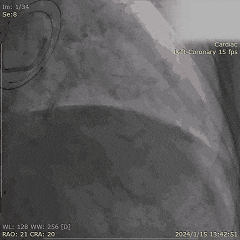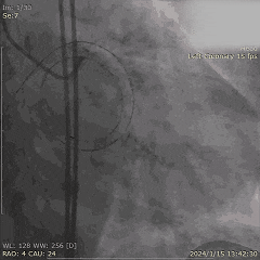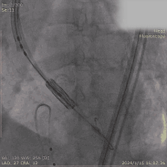 患者取平卧位,局麻+镇静,颈内静脉置入中心静脉置管,测中心静脉压3cmH20,左侧动脉穿刺置管监测动脉压力。穿刺右桡动脉置入6F桡动脉鞘管,穿刺右侧股静脉置入6F鞘管,穿刺右侧股动脉预置两把Proglide缝合器,穿刺左侧股动脉置入6F鞘管。将加硬导丝送至升主动脉,沿加硬导丝送入爱德华14F动脉鞘管。穿刺房间隔,予肝素4000单位,ACT大于250秒。经右桡动脉在导丝引导下送脑保护装置分别于头臂干及左侧颈总动脉释放保护。经左股动脉送入5F猪尾导管,在释放体位下行主动脉根部造影。6F JL4.0造影导管行冠脉造影示LAD中段狭窄50%,OM1中段狭窄60%,TIMI血流III级,余冠脉未见明显异常。送入INOUE26mm球囊至二尖瓣处,分别以24mm及25mm直径分别扩张瓣口一次,扩张后超声再次评价,瓣口面积上升至1.5cm2,瓣口返流较前未见明显改变。经右股静脉将临时起搏电极置于右心室心尖部。撤出加硬导丝及球囊,在AL2导管指引下,直头导丝跨瓣至左心室,沿导丝送猪尾导管至左心室,测得跨瓣压差46mmHg,经导管送Angelguide加硬导丝至左心室内,沿加硬导丝送Edwards23主动脉瓣膜系统至主动脉瓣,在释放体位下,以180次/分起搏后,标准容积释放瓣膜,复查造影示瓣膜支架膨胀良好,见少量瓣周漏,撤出瓣膜输送系统。行经胸超声心动图提示:主动脉瓣位为人工瓣回声,位置固定,瓣叶活动良好,见少量瓣周漏级反流。主动脉造影提示主动脉无夹层、出血。撤出14F鞘管,对侧造影,腹主动脉、髂动脉、股总动脉未见明显异常,Proglide缝合股动脉穿刺点,应用弹力绷带加压包扎。撤出脑保护装置,应用桡动脉压迫器止血。手术过程顺利,血压心率平稳,返回病房。