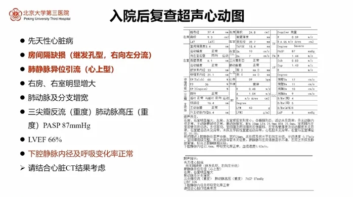 当地医院超声心动图提示先天性心脏病(房间隔缺损、房水平左向右分流)、右心增大、主肺动脉增宽、三尖瓣大量反流及肺动脉高压(重度)。