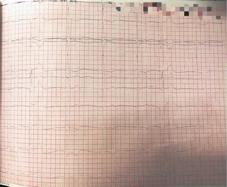患者10余年前开始剧烈活动后出现胸闷、气喘,休息后可自行缓解,未予以重视。2年前患者逐渐出现双下肢水肿、乏力,门诊心电图提示窦性心律、Ⅲ°AVB、心室率40次/分,建议安置心脏起搏器治疗,患者拒绝。后服药治疗,症状仍反复发作。1周前患者上诉不适再发,程度较前加重,稍动即喘,夜间不能平卧,伴有纳差、双下肢水肿,急诊收住。