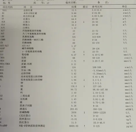 生化分析+心肌酶谱+脑肽钠(入院当天):尿素轻度升高7.71mmol/L↑;白蛋白轻度降低33.8g/L↓;电解质、肝肾功能大致正常;(K+:4.33mmol/L,Na+:136mmol/L);肌钙蛋白、CK、CKMB等心肌损伤标志物正常;NT-proBNP:6690pg/ml ↑↑
