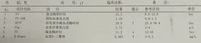 血常规(入院当天):WBC 5.23*109/L、N% 55.8%、L% 37.9%、PLT 135*109/L、HGB 121g/L↓,大小便常规未见明显异常;