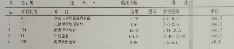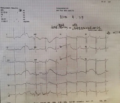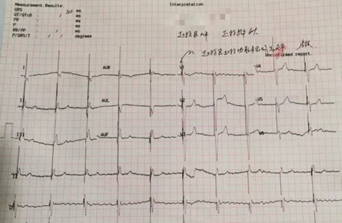 心电图(入院当天):房颤心律、三度房室传导阻滞、室性逸搏心律、室性期前收缩、QRS宽度180ms