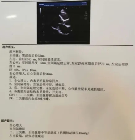 全心增大:LA 40mm;LVEDD 70mm;RA 增大;RV 26mm;ISVT 12mm,LVPWT 11mm