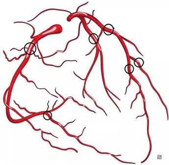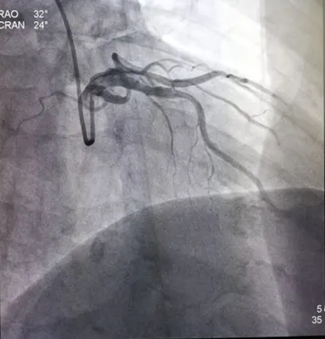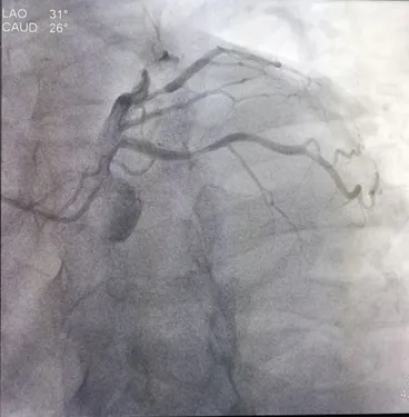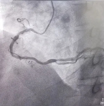 造影结果:冠脉多支病变,LAD近、中段50%狭窄,LCX 中段75%狭窄,D2 近段70%狭窄RCA近段50%狭窄,PDA近段60%狭窄。