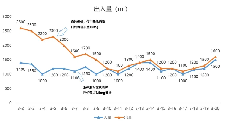 注:患者体重逐渐至干重,故加用托伐普坦后尿量减少;患者症状改善后,减少托伐普坦剂量维持