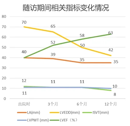 半年后复查心脏彩超:各心腔明显缩小:LA 35mm,LVEDD 50mm,RA 正常,RV 20mm,ISVT 11mm,LVPWT 8mm,EF58%