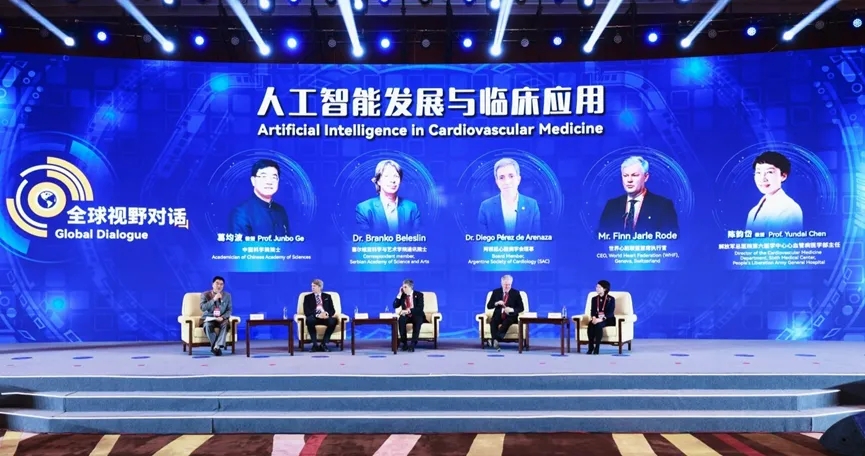 中国科学院院士、复旦大学附属中山医院葛均波教授首先发表“人工智能的机遇与挑战”主题演讲,系统回顾并展望AI在心血管疾病领域的发展。随后,塞尔维亚心脏病学会前任主席、贝尔格莱德大学塞尔维亚临床中心心脏病功能诊断与血流动力学科主任Branko Beleslin教授,阿根廷心脏病学会理事、布宜诺斯艾利斯意大利医院心脏科心血管影像部与研究部主任Diego Pérez de Arenaza教授,世界心脏联盟首席执行官Finn Jarle Rode先生,以及中国人民解放军总医院陈韵岱教授共同参与讨论,本场对话由首都医科大学附属北京安贞医院周玉杰教授主持。