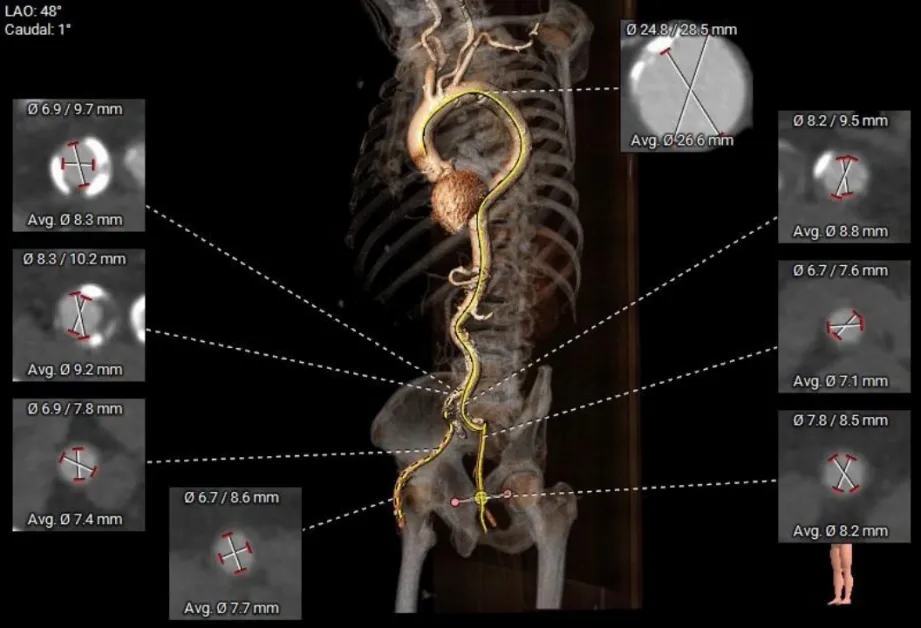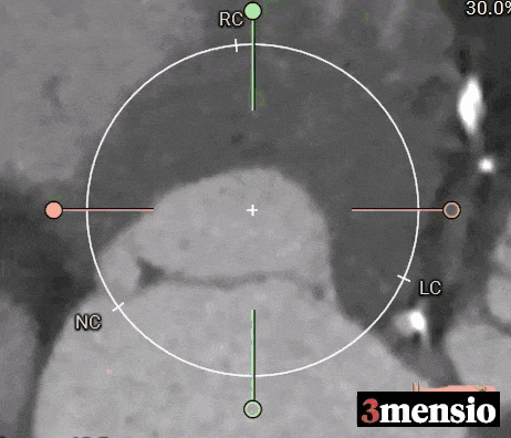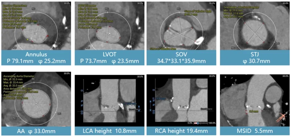 术前CT评估结果如下:患者为三叶瓣,右无窦间、左右窦间及瓣叶存在广泛钙化,钙化积分439分;瓣环径为25.2mm,LVOT:23.5mm,窦部空间可,左冠偏低,高度10.8mm;右冠脉高度可,主动脉弓大弯侧点状钙化。