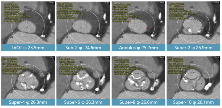 多平面测量结果分析:该患者流出道较小,为倒梯形机构,瓣上结构无明显限制区域,瓣上无法提供足够封堵,预估封堵区域位于瓣环附近,钙化主要分布于瓣上,瓣环和流出道没有明显钙化,宜选择带裙边设计瓣膜,采用Taurus 26号瓣膜,可提供足够的oversize率,且带裙边设计进一步减少瓣周漏可能性,但相应起搏器风险偏大。