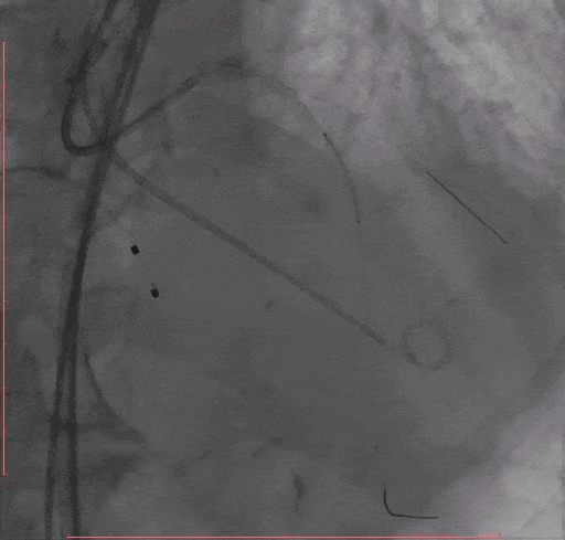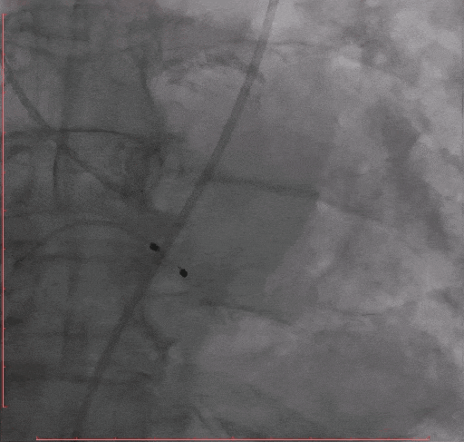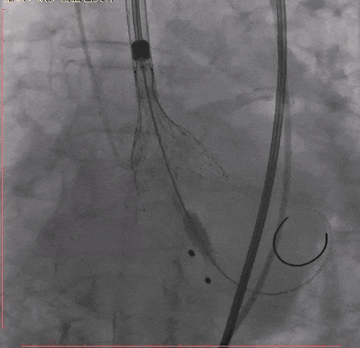 患者84岁男性,根据超声心动图结果,主动脉瓣重度狭窄诊断明确,曾一过性存在射血分数减低,目前存在心力衰竭症状,有瓣膜置换手术指征,与心外科沟通,考虑其无法耐受外科手术,考虑内科介入解决患者主动脉瓣病变。术前已请体外循环、麻醉科等科室进行多学科病例讨论,拟首选局麻镇静下予患者TAVR治疗,但患者冠脉病变重,对血流动力学耐受差,术中出现出现循环崩溃风险大,做好气管插管全麻准备,同时穿刺动静脉备ECMO、IABP。向患者及家属交代病情,签署知情同意,完善术前准备。